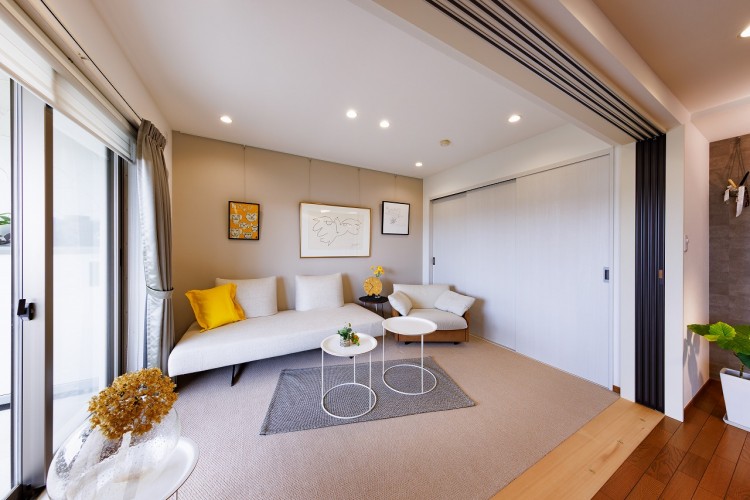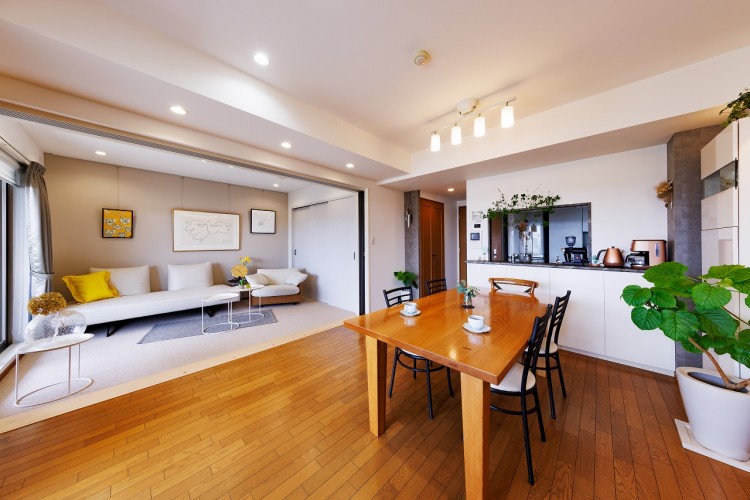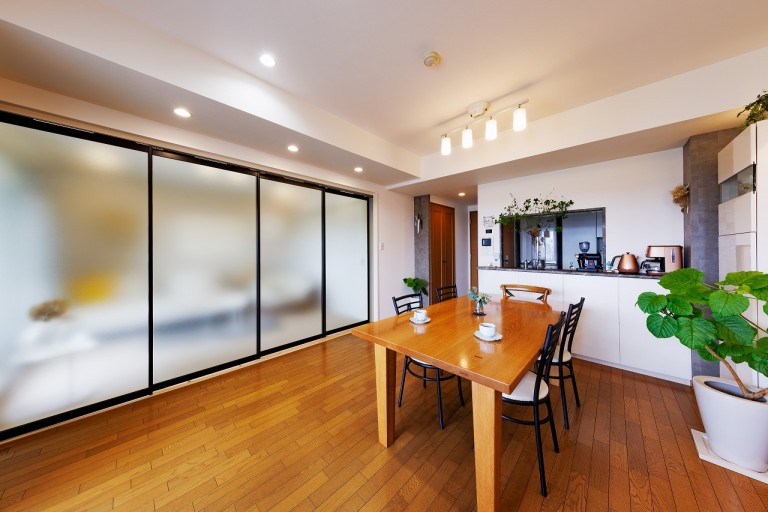 ◆リビング隣の旧和室との間仕切壁は出来るだけ無くし解放感を。間仕切りパーテーションは4枚のアクリル扉を採用。空間を仕切りながらも光を取り入れられるため、LDと一体感のある明るい空間になりました。